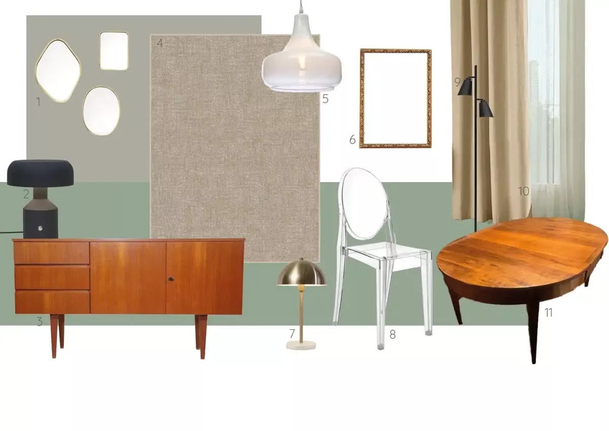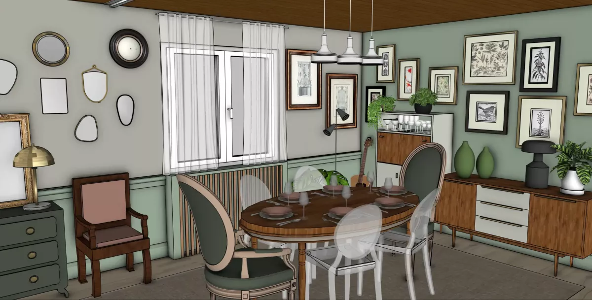 Pour relever le défi :✨ Pose d’un sol Coretec avec une zone repas délimitée✨ Moulures et plinthes Orac détournées pour cacher les raccords & intégrer des lumières✨ Couleurs douces & profondes (Vert Nobilé, Vert Luxembourg – Guittet)✨ Mobilier customisé, mix and match de cadres & souvenirs de famille✨ Chaises Victoria Ghost x fauteuils médaillons Louis XVI✨ Luminaires It’s about Romi pour moduler les ambiancesRésultat : un lieu chaleureux, élégant, vivant – à leur image